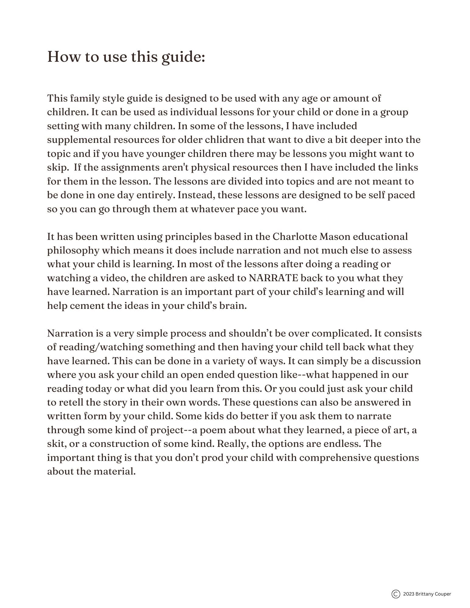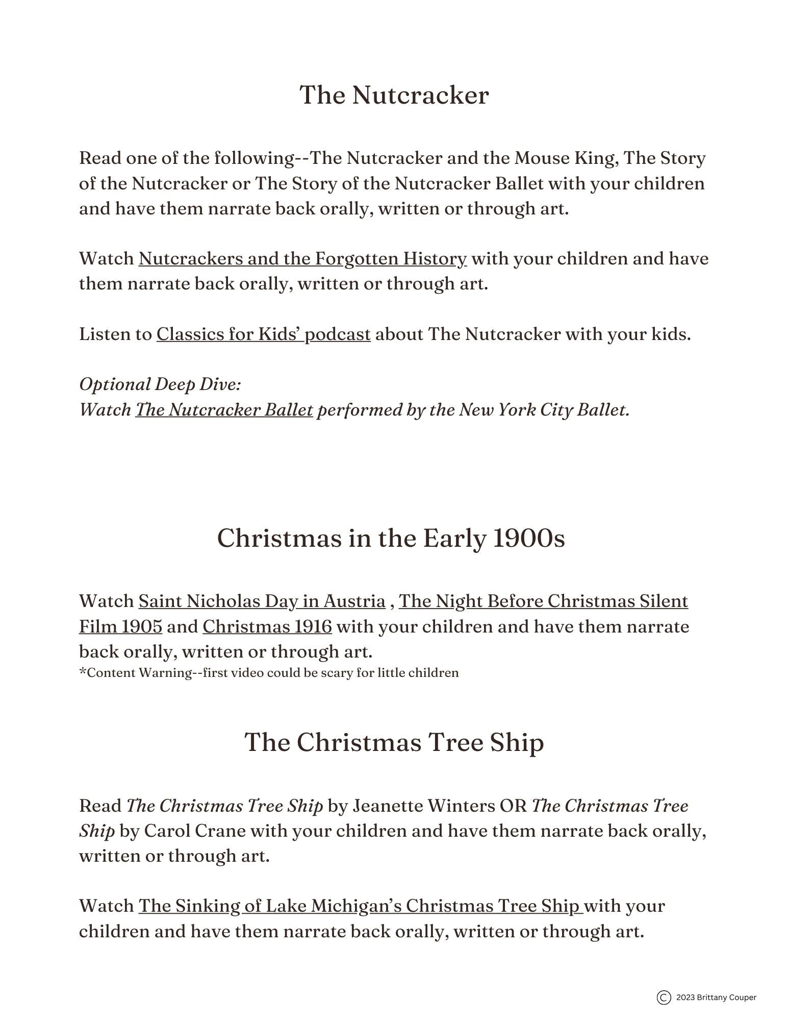 It is a family style history guide that takes you through 11 topics that can be spread out to use through the whole month of December or you can use it over multiple years for shorter lessons. It includes books, documentaries and primary sources as well as optional deep dives for older students who want to learn more about a specific topic.