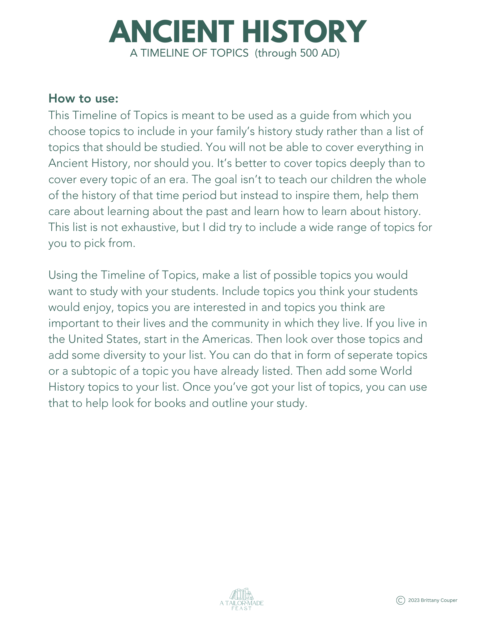 Gain the confidence and empowerment you need to create a journey into history designed specifically for your homeschool with this Ancient History: Timeline of Topics!