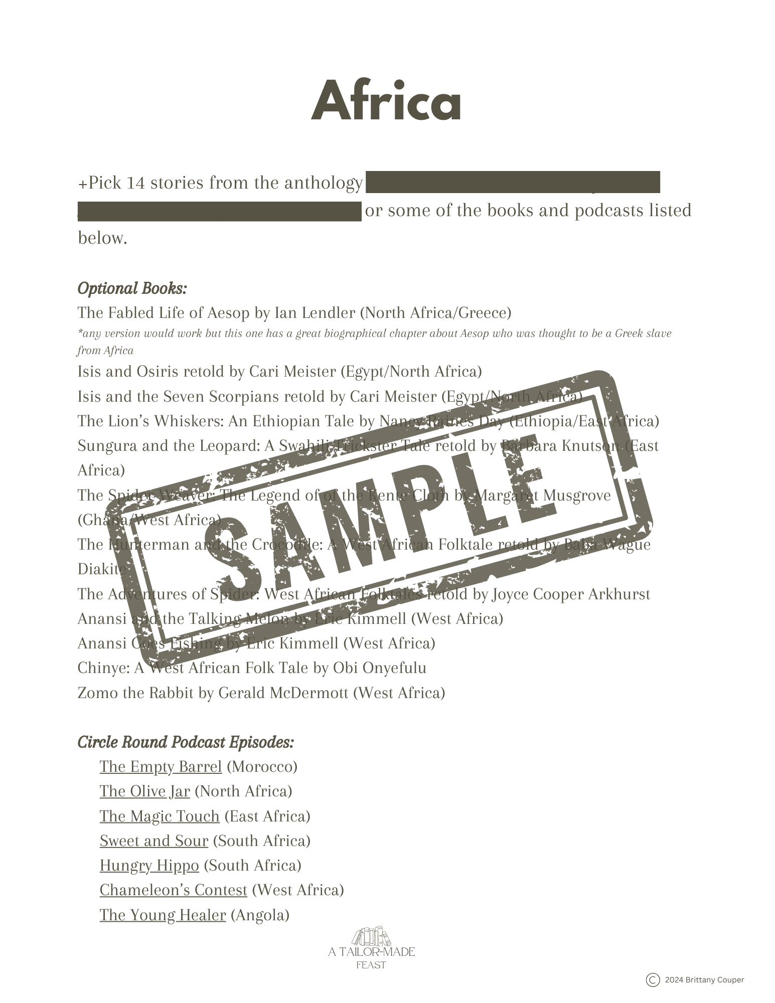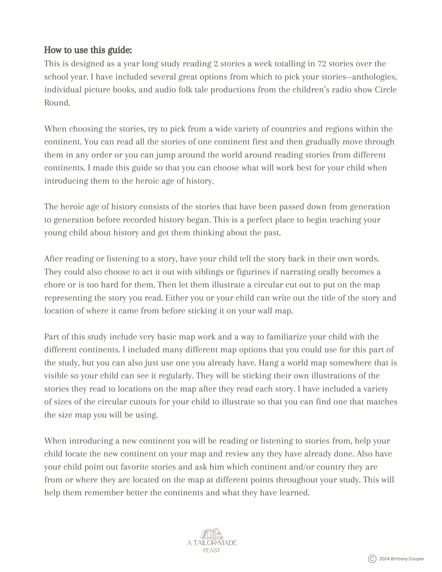 This study designed as a year long study reading 2 stories a week totaling 72 stories over the school year. A very large resource list is included for each continents providing many great options from which to pick your stories--anthologies, individual picture books, and audio folk tale productions from the children’s radio show Circle Round. It is based in Charlotte Mason principles using the practice of narration to help the student engage and retain the stories. It also includes some basic map work to help the child remember the continents and where the stories all take place.