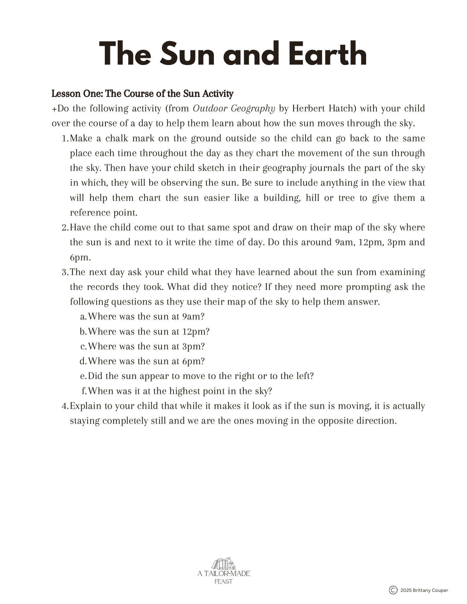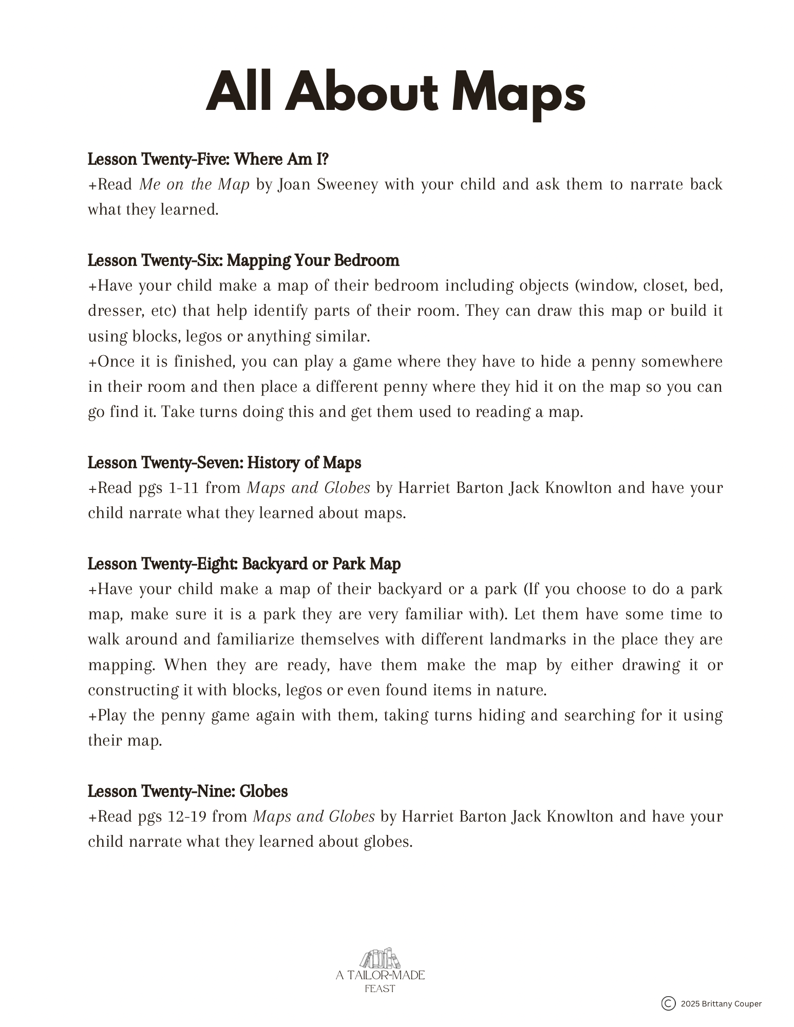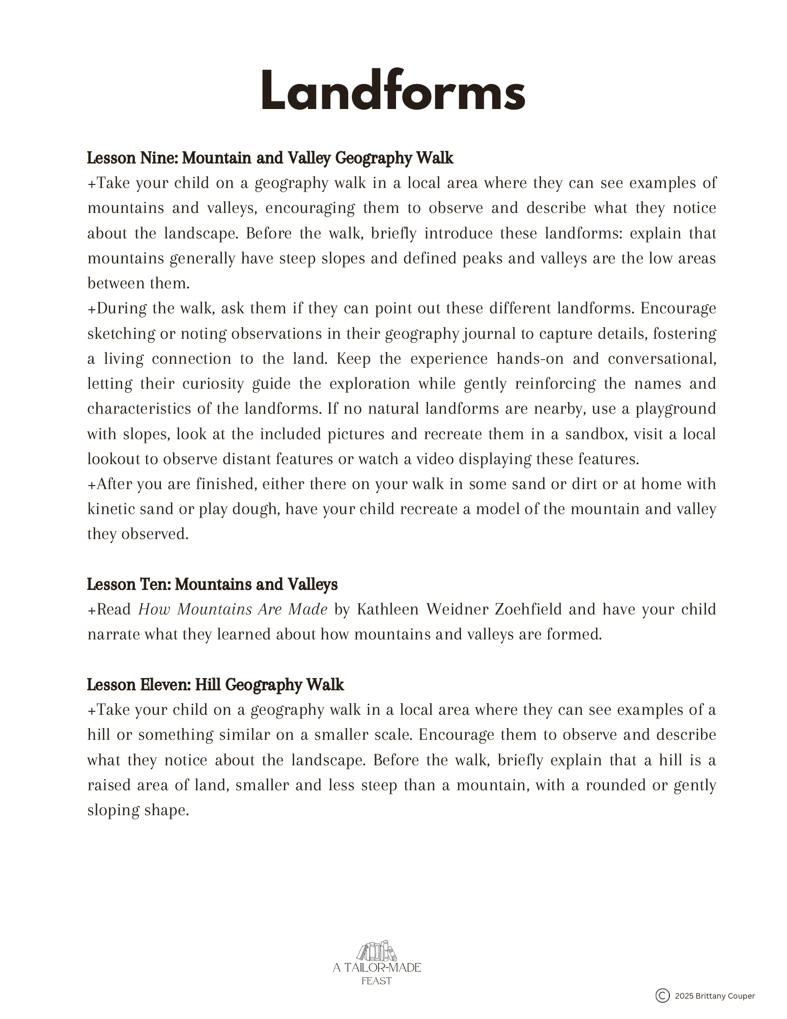 This 40-lesson curriculum, crafted for a year-long journey (1–2 lessons per week), blends Charlotte Mason’s timeless educational principles with engaging, modern activities. Your child will explore the movement of the sun and Earth, discover basic landforms, and master the art of using and creating maps and globes—all while cultivating a lifelong love for geography through hands-on experiments, living books, narration, and immersive geography walks.
