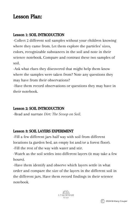 'Living Soil: An Exploration of Soil Science with Labwork' is a family style science guide that would be ideal for Elementary and early Middle School students. It consists of 32 lessons including 12 related experiments/activities. In it you will find a list of optional books including science biographies and picture books that you can use to supplement your study.