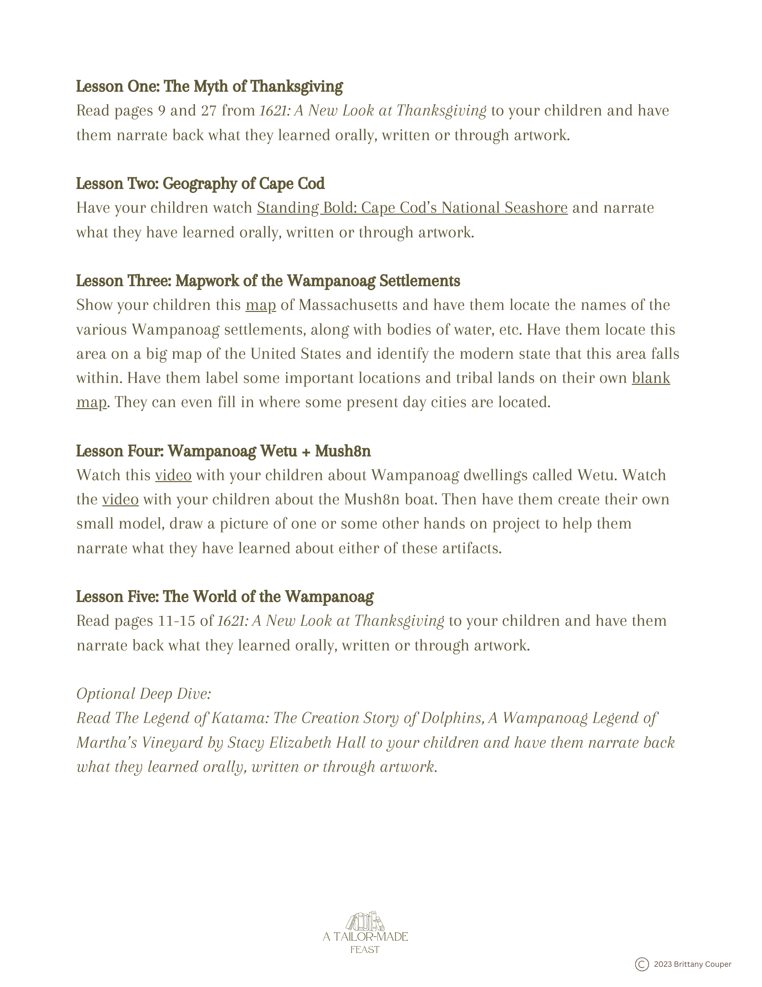 This guide contains so much more than the traditional Thanksgiving holiday guide out there. It will dive into the actual history of the holiday and explore why the myth was created. It begins by exploring the history of the Wampanoag people before and at the time of colonization. Then it will take you on to learn about the Separatists and their arrival in the Americas and their interaction with the Wampanoag. You will read primary source documents about the first Thanksgivings and explore the reasons behind those events. Then it will take you on a historic journey to discover how America created the holiday and the traditions of Thanksgiving. The study ends by learning about the Native American's views on the holiday and then with a project where your children get to present their own thoughts on the holiday.